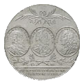 Frånsidan visar tre porträtt inom ovala pärlramar; 1) Gustav Vasa med omskriften GVSTAVVS I D·G·REX SV [Gustav I, med Guds nåde Sveriges konung] 2) Gustav II Adolf med omskriften GVST·II AD·D·G·REX SVE [Gustav II Adolf med Guds nåde Sveriges konung] och 3) Fredrik I med omskriften FRIDERICVS I D·G·R·SV· [Fredrik I med Guds nåde Sveriges konung]. Över medaljongerna två sammanbundna palmkvistar och under dem två hoplagda lagerkvistar och myntmästarens initialer C B. I avskärningen: IN MEMOR.VINDICATAE / LIBERT·AC RELIG [Till minne av räddad politisk och religiös frihet].